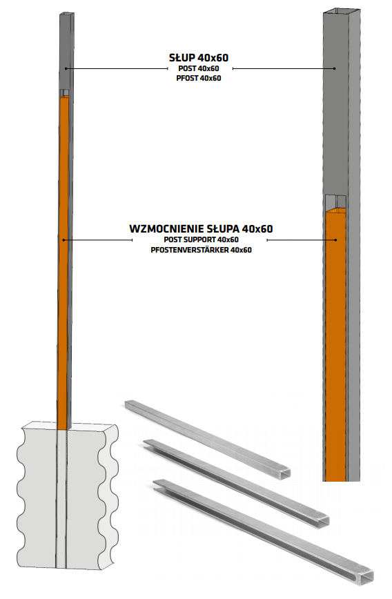 Rozmiar przedłużek 35x55x1200x2 mm Przedłużki pasują do profilu 40×60 mm  o max grubości 2 mm