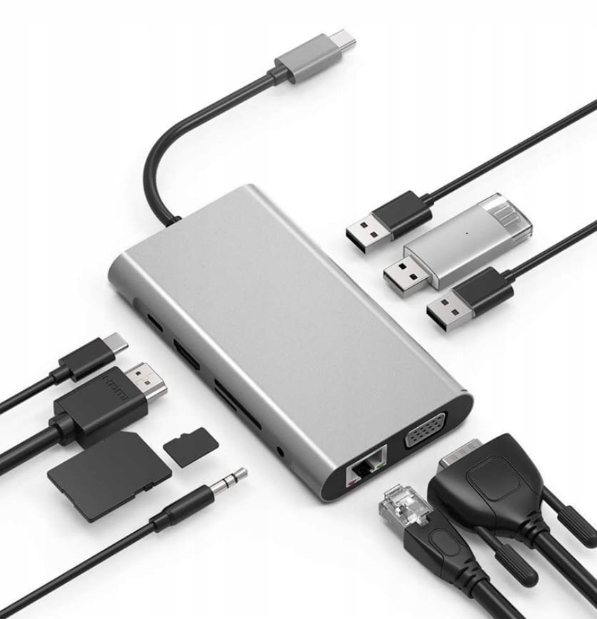 {col/50/} HUB USB-C ADAPTER 11w1 z portami: HDMI 4K, VGA, 3x USB 3.0, SD i micro SD, mini Jack, Gigabit Ethernet, Power Delivery Wysokiej jakości wielofunkcyjny adapter 11w1 od ZENWIRE z obsługą wszystkich najbardziej niezbędnych portów. Hub usb c ethernet hdmi działa zarówno ze sprzętami Apple Macbook jak i Windows,…