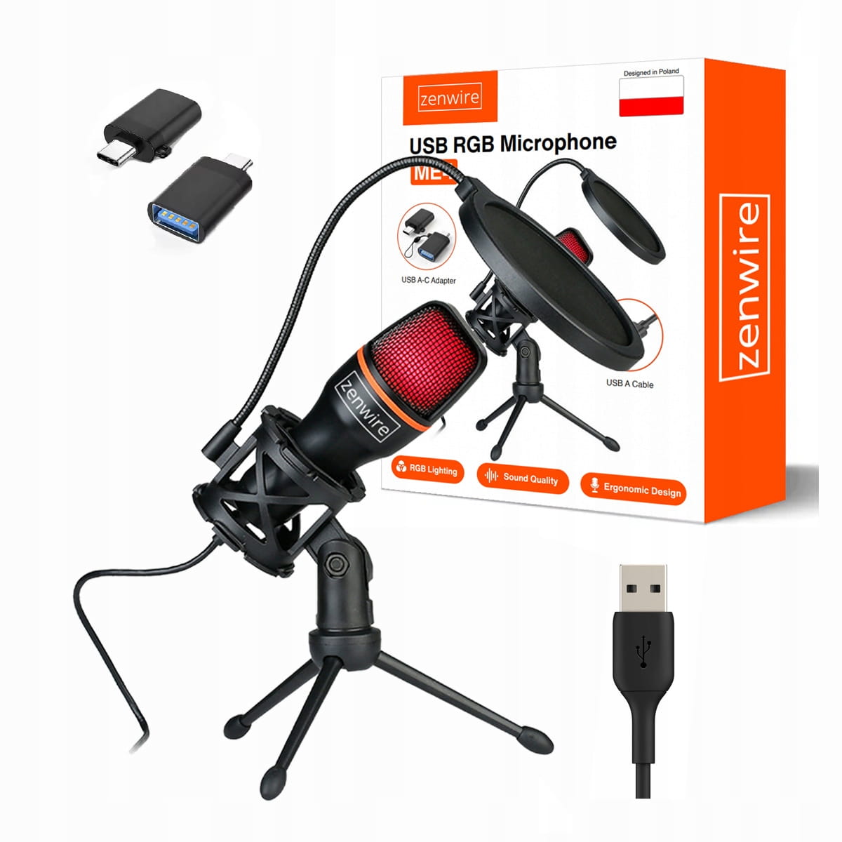 Mikrofon Pojemnościowy Studyjny do Komputera PC Gamingowy RGB USB-C USB 3.0 Zenwire ME4